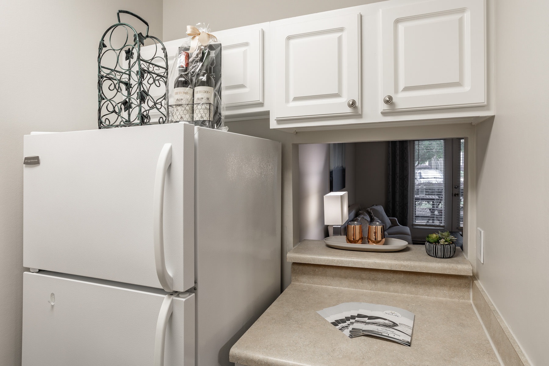 • Spacious and well lit living room with wood floors and a large window with access to the kitchen