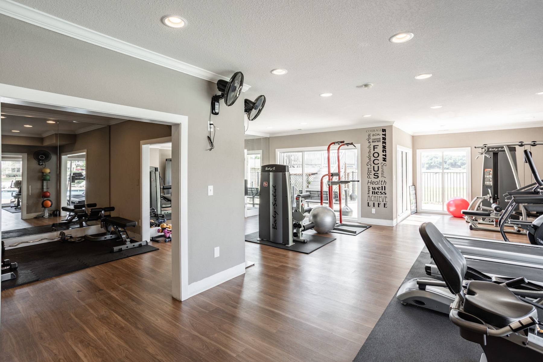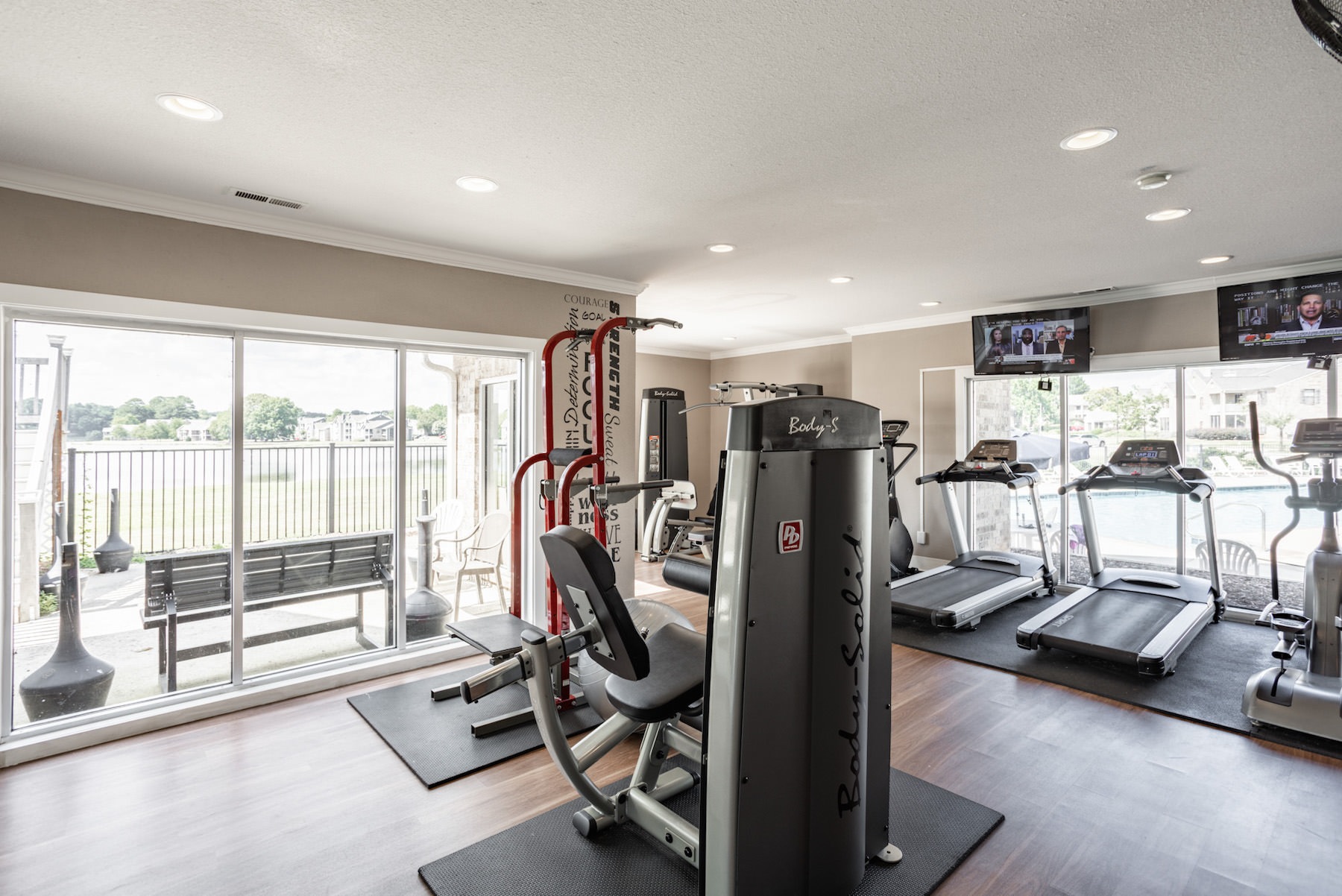 • Large fitness center with large windows and plenty of equipment